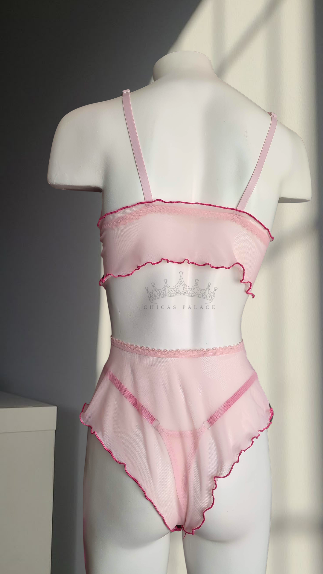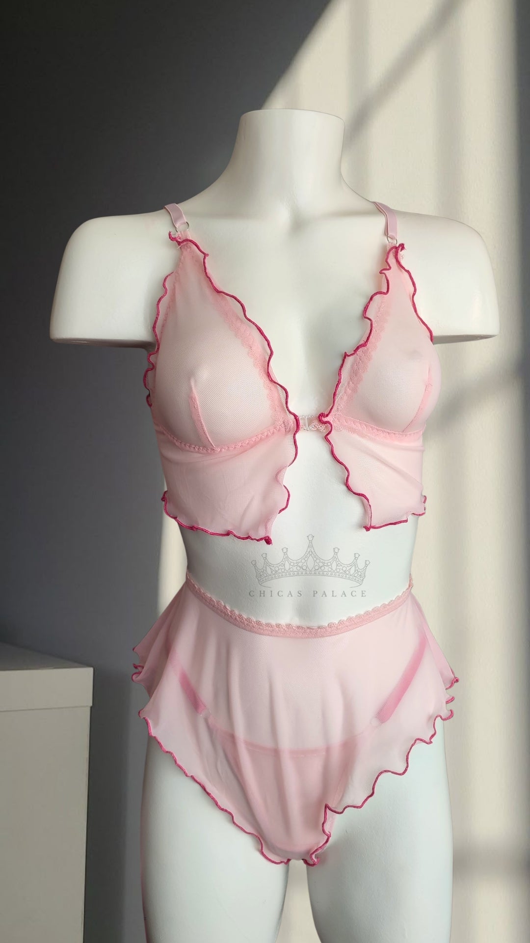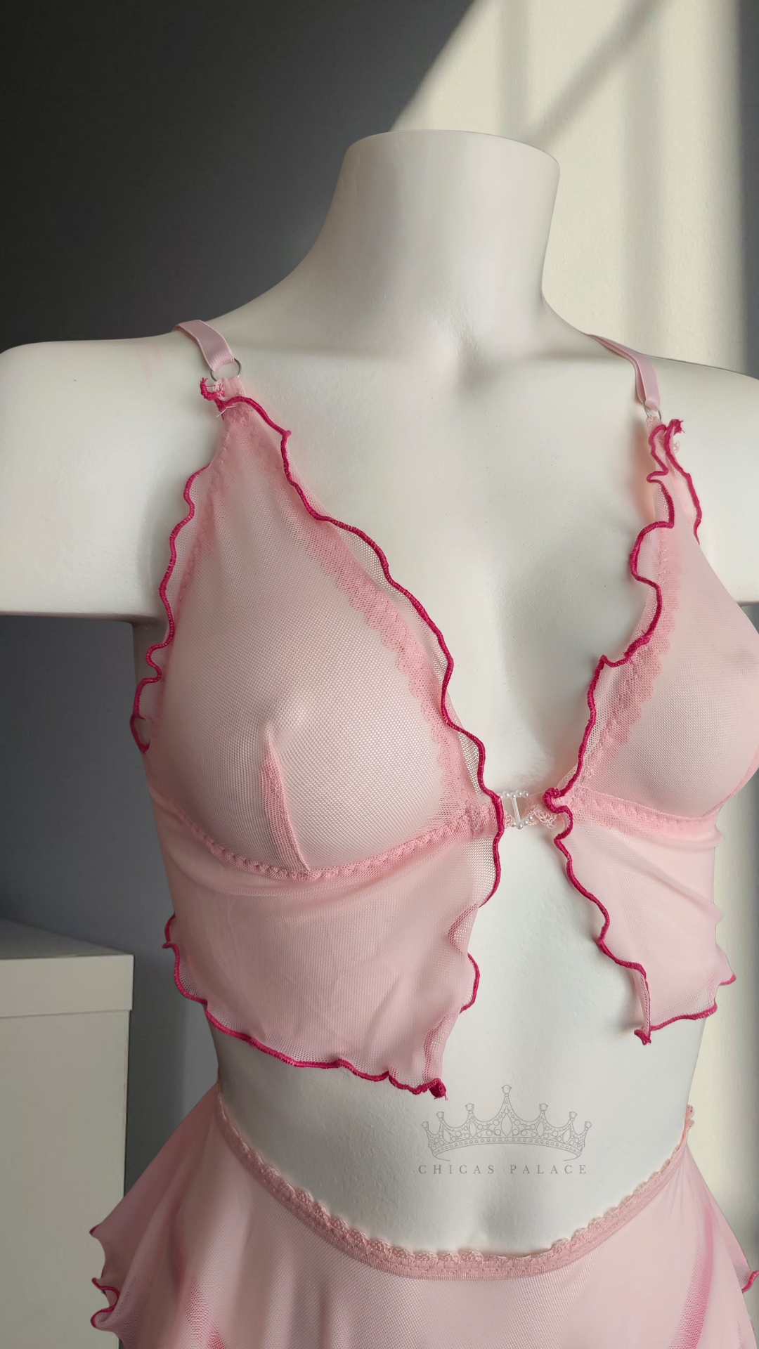 “Sweet Bloom” está confeccionado en malla suave translúcida con delicados vuelos que enmarcan la silueta con movimiento y feminidad. Su diseño tipo pijama aporta comodidad sin perder el encanto romántico que lo hace especial.